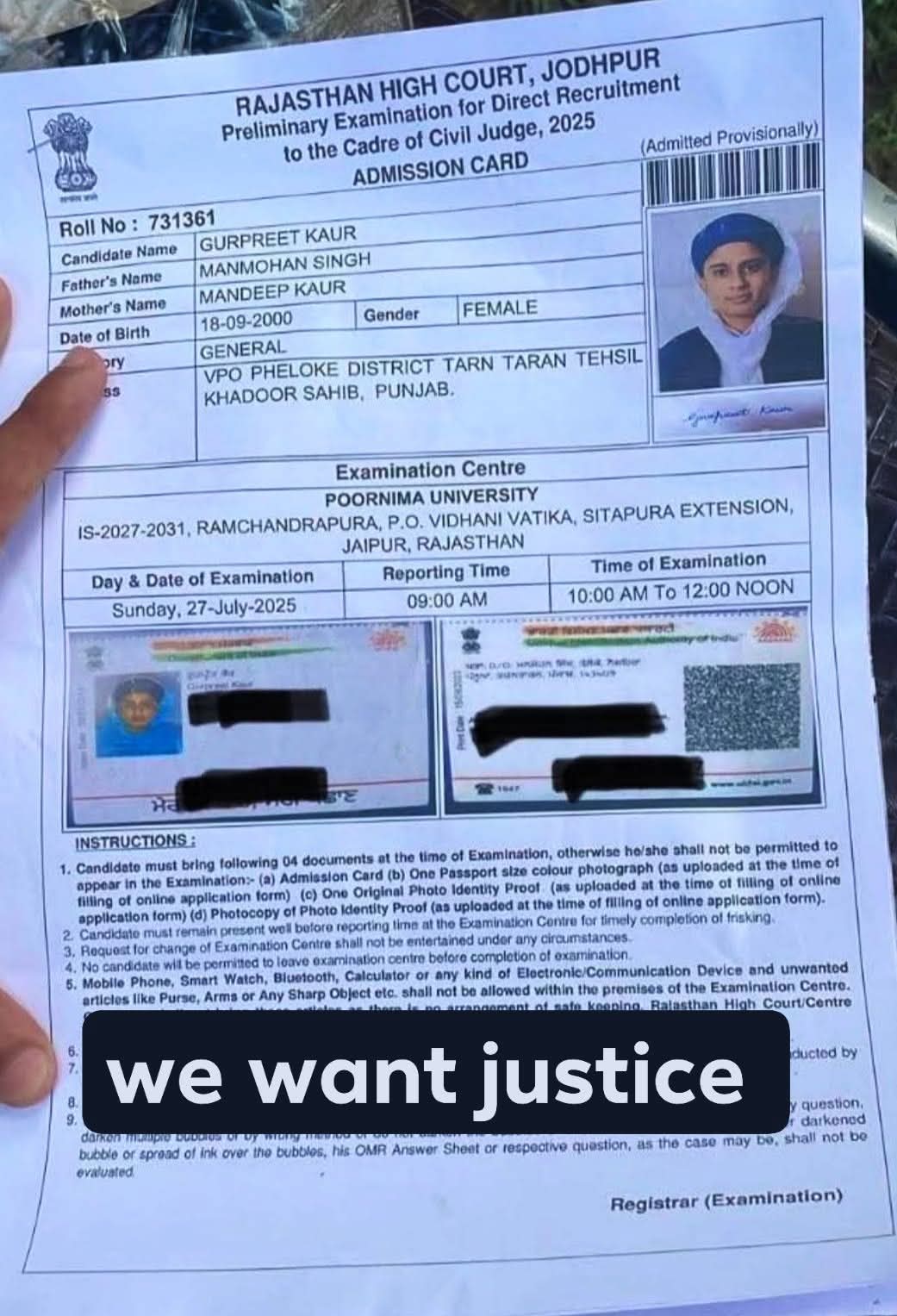 ਮੇਰਾ ਨਾਮ ਰੋਲ ਨੰਬਰ ਸੂਚੀ ਵਿੱਚ ਹੈ, ਮੈਂ ਉਹ ਸਾਰਾ ਸਮਾਨ ਲੈ ਕੇ ਆਈ ਹਾਂ ਜਿਸਦੀ ਇਜਾਜ਼ਤ ਸੀ: ਵਿਦਿਆਰਥਣ ਗੁਰਪ੍ਰੀਤ ਕੌਰ ਨੇ ਵੀਡੀਓ ਵਿੱਚ ਕਿਹਾ ਕਿ ਉਸਦੀ ਪੂਰਨਿਮਾ ਯੂਨੀਵਰਸਿਟੀ, ਜੈਪੁਰ, ਰਾਜਸਥਾਨ ਵਿੱਚ ਨਿਆਂਇਕ ਪ੍ਰੀਖਿਆ ਸੀ। ਕਿਸੇ ਵੀ ਹੋਰ ਵਿਦਿਆਰਥੀ ਵਾਂਗ, ਮੈਂ ਵੀ ਇਸ ਯੂਨੀਵਰਸਿਟੀ ਵਿੱਚ ਪ੍ਰੀਖਿਆ ਦੇਣ ਆਈ ਸੀ। ਮੇਰਾ ਰੋਲ ਨੰਬਰ ਸੂਚੀ ਵਿੱਚ ਹੈ। ਮੈਂ ਕੁਝ ਵੀ ਨਹੀਂ ਲਿਆਈ ਜਿਸਦੀ ਇਜਾਜ਼ਤ ਨਹੀਂ ਸੀ।