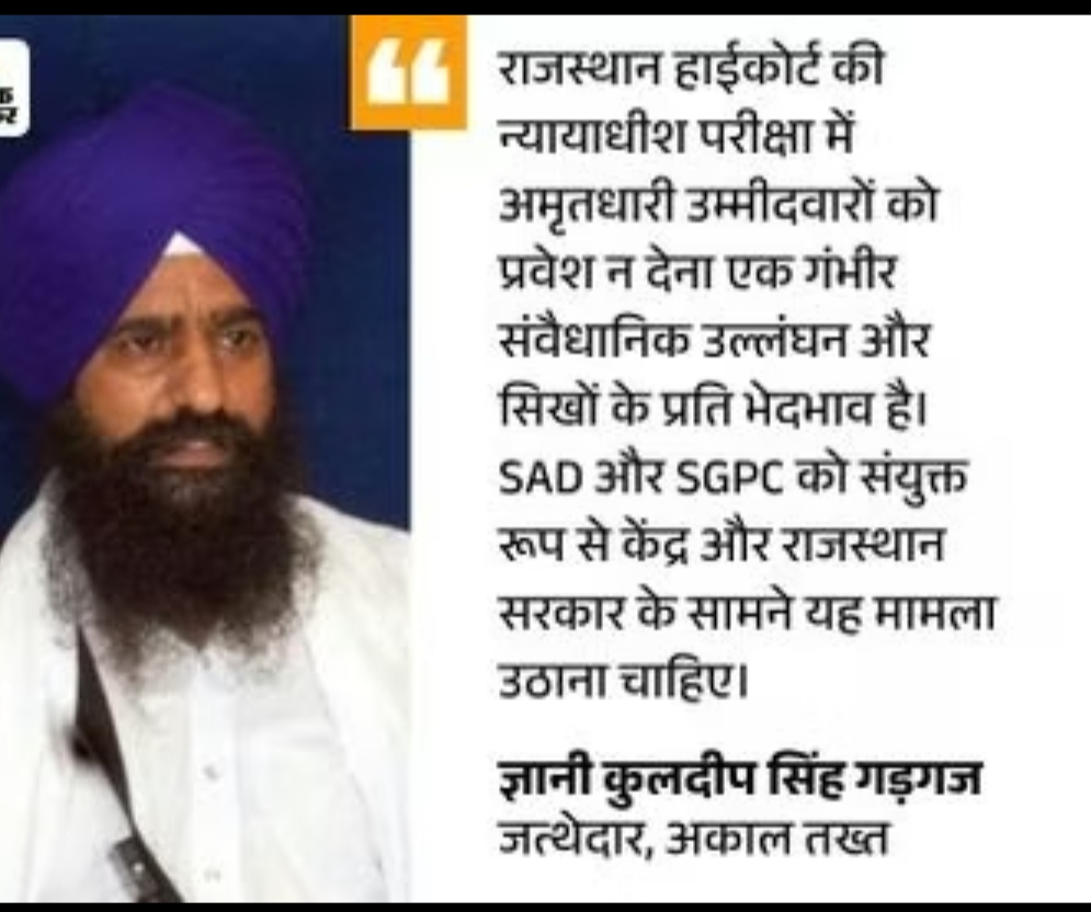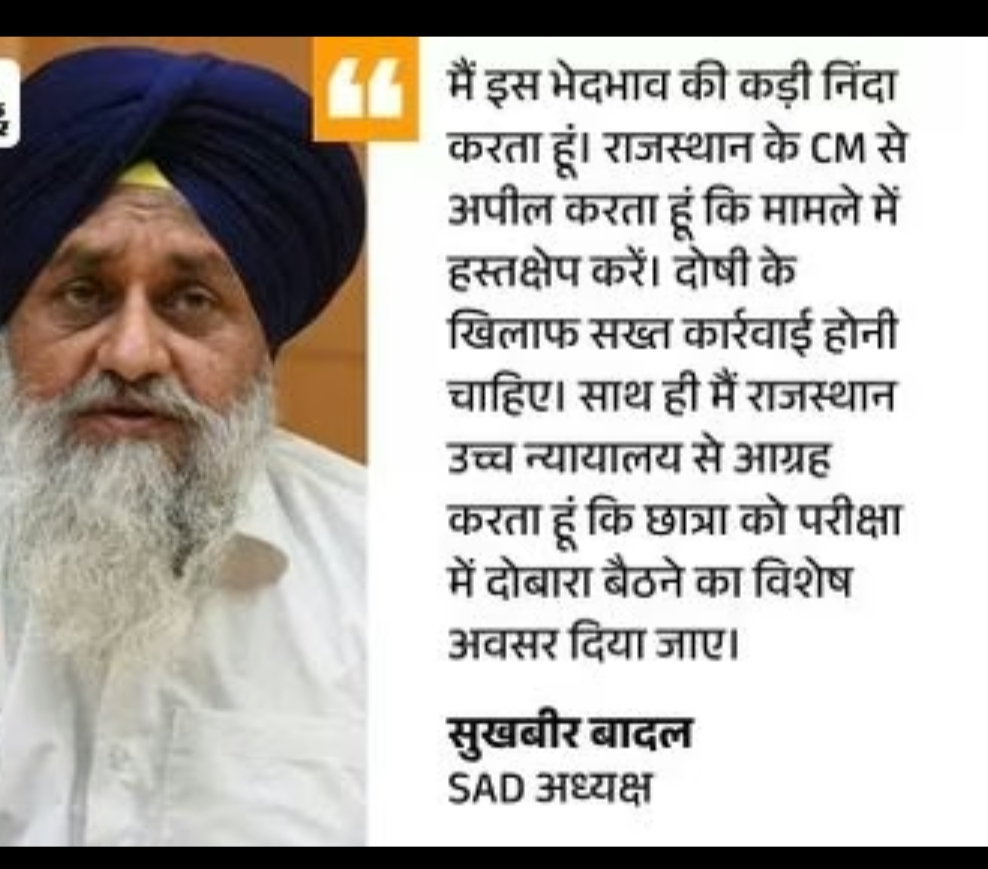ਪੰਜਾਬ ਦੇ ਤਰਨਤਾਰਨ ਜ਼ਿਲ੍ਹੇ ਦੀ ਇੱਕ ਸਿੱਖ ਵਿਦਿਆਰਥਣ, ਜੋ ਰਾਜਸਥਾਨ ਦੇ ਜੈਪੁਰ ਦੀ ਪੂਰਨਿਮਾ ਯੂਨੀਵਰਸਿਟੀ ਵਿੱਚ ਆਯੋਜਿਤ ਨਿਆਂਇਕ ਸੇਵਾਵਾਂ ਪ੍ਰੀਖਿਆ (ਪੀਸੀਐਸ-ਜੇ) ਲਈ ਆਈ ਸੀ, ਨੂੰ ਉਸਦੇ ਧਾਰਮਿਕ ਚਿੰਨ੍ਹਾਂ (ਕੇ) ਕਾਰਨ ਪ੍ਰੀਖਿਆ ਕੇਂਦਰ ਵਿੱਚ ਦਾਖਲ ਹੋਣ ਤੋਂ ਰੋਕ ਦਿੱਤਾ ਗਿਆ।