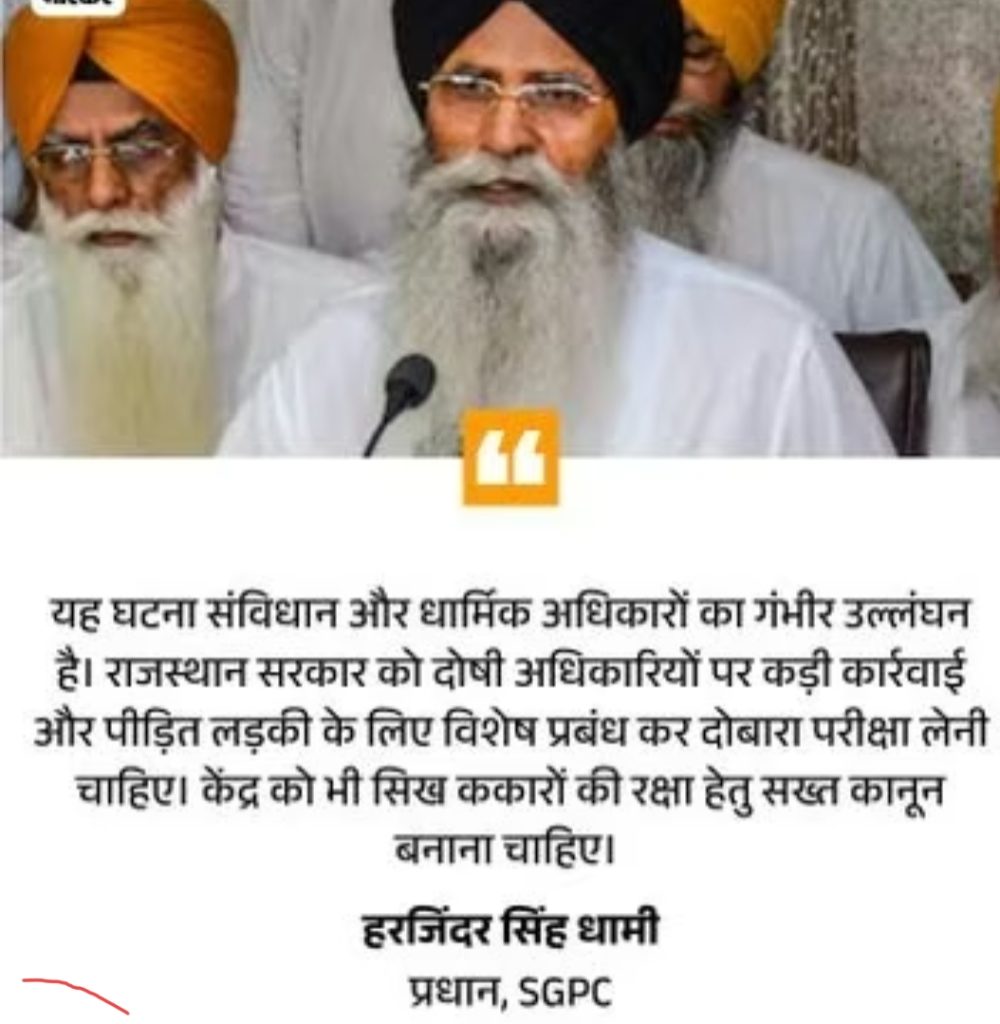 ਉਨ੍ਹਾਂ ਪ੍ਰਸ਼ਾਸਨ ਤੋਂ ਪੁੱਛਿਆ ਕਿ ਜੇਕਰ ਕੋਈ ਸਿੱਖ ਵਕੀਲ ਜਾਂ ਜੱਜ ਆਪਣੇ ਧਾਰਮਿਕ ਚਿੰਨ੍ਹਾਂ ਨਾਲ ਅਦਾਲਤ ਵਿੱਚ ਬੈਠ ਸਕਦਾ ਹੈ, ਤਾਂ ਫਿਰ ਇੱਕ ਸਿੱਖ ਵਿਦਿਆਰਥੀ ਨੂੰ ਪ੍ਰੀਖਿਆ ਦੇਣ ਤੋਂ ਕਿਉਂ ਰੋਕਿਆ ਗਿਆ? ਗਰੇਵਾਲ ਨੇ ਰਾਜ ਅਤੇ ਕੇਂਦਰ ਸਰਕਾਰ ਤੋਂ ਇਸ ਘਟਨਾ ਦਾ ਸਖ਼ਤ ਨੋਟਿਸ ਲੈਣ ਦੀ ਮੰਗ ਕੀਤੀ ਹੈ ਅਤੇ ਕਿਹਾ ਹੈ ਕਿ ਜ਼ਿੰਮੇਵਾਰ ਅਧਿਕਾਰੀਆਂ ਵਿਰੁੱਧ ਕਾਰਵਾਈ ਕੀਤੀ ਜਾਣੀ ਚਾਹੀਦੀ ਹੈਰਾਜਸਥਾਨ ਵਿੱਚ ਪੰਜਾਬ ਦੇ ਵਿਦਿਆਰਥੀ ਨੂੰ ਪ੍ਰੀਖਿਆ ਦੇਣ ਤੋਂ ਰੋਕਿਆ ਗਿਆ: ਕੜਾ-ਕ੍ਰਿਪਾਨ ਹਟਾਉਣ ਲਈ ਕਿਹਾ ਗਿਆ; SGPC ਨੇ ਕਿਹਾ- ਸਿੱਖਾਂ ਦਾ ਅਪਮਾਨ, ਯੂਨੀਵਰਸਿਟੀ ਨੇ ਸਪੱਸ਼ਟ ਕੀਤਾ- ਇਹ ਇੱਕ ਦਿਸ਼ਾ-ਨਿਰਦੇਸ਼ ਸੀ