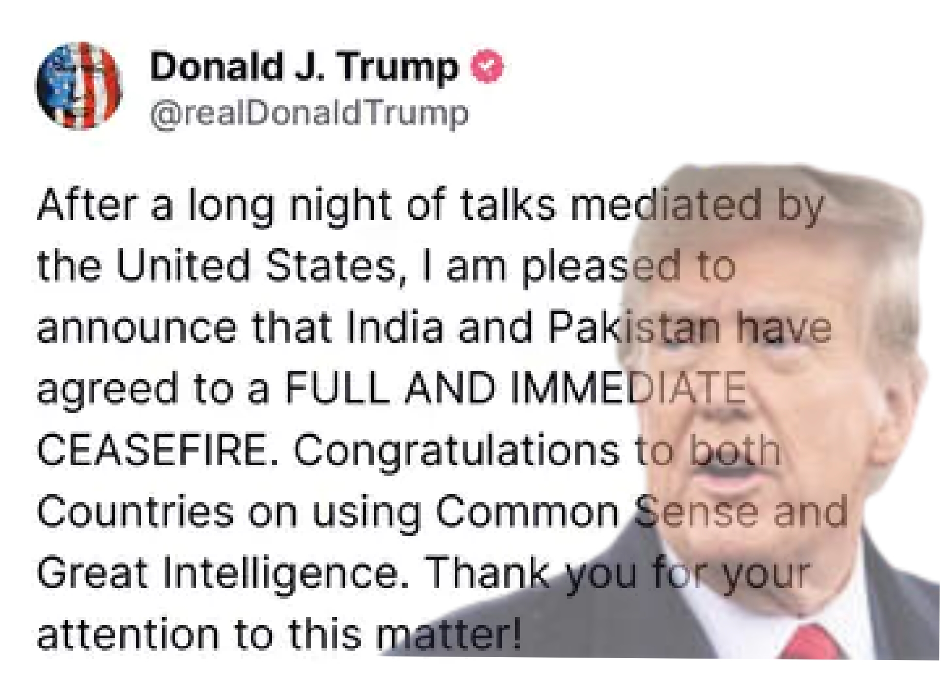 ਜੰਗਬੰਦੀ ….. ਡੋਨਾਲਡ ਟਰੰਪ ਨੇ ਕਿਹਾ- ਭਾਰਤ ਅਤੇ ਪਾਕਿਸਤਾਨ ਜੰਗਬੰਦੀ ਲਈ ਸਹਿਮਤ ਹੋਏ: