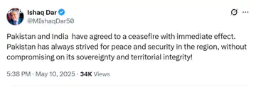 ਪਾਕਿਸਤਾਨ ਦੇ ਵਿਦੇਸ਼ ਮੰਤਰੀ ਇਸਹਾਕ ਡਾਰ ਨੇ ਕਿਹਾ, ‘ਪਾਕਿਸਤਾਨ ਅਤੇ ਭਾਰਤ ਤੁਰੰਤ ਪ੍ਰਭਾਵ ਨਾਲ ਜੰਗਬੰਦੀ ‘ਤੇ ਸਹਿਮਤ ਹੋ ਗਏ ਹਨ।’ ਪਾਕਿਸਤਾਨ ਨੇ ਹਮੇਸ਼ਾ ਆਪਣੀ ਪ੍ਰਭੂਸੱਤਾ ਅਤੇ ਖੇਤਰੀ ਅਖੰਡਤਾ ਨਾਲ ਸਮਝੌਤਾ ਕੀਤੇ ਬਿਨਾਂ ਖੇਤਰ ਵਿੱਚ ਸ਼ਾਂਤੀ ਅਤੇ ਸੁਰੱਖਿਆ ਲਈ ਯਤਨਸ਼ੀਲ ਰਿਹਾ ਹੈ।