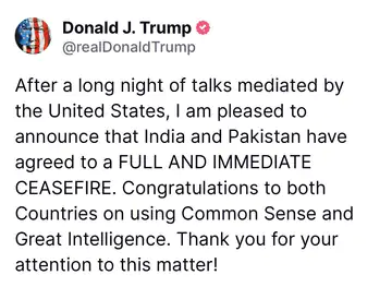 ਡੋਨਾਲਡ ਟਰੰਪ ਨੇ ਕਿਹਾ- ਭਾਰਤ ਅਤੇ ਪਾਕਿਸਤਾਨ ਜੰਗਬੰਦੀ ਲਈ ਸਹਿਮਤ ਹੋਏ: ਮੈਂ ਸਾਰੀ ਰਾਤ ਦੋਵਾਂ ਨੂੰ ਸਮਝਾਇਆ, ਮੈਂ ਉਨ੍ਹਾਂ ਨੂੰ ਇੱਕ ਸਮਝਦਾਰੀ ਵਾਲਾ ਫੈਸਲਾ ਲੈਣ ਲਈ ਵਧਾਈ ਦਿੰਦਾ ਹਾਂ